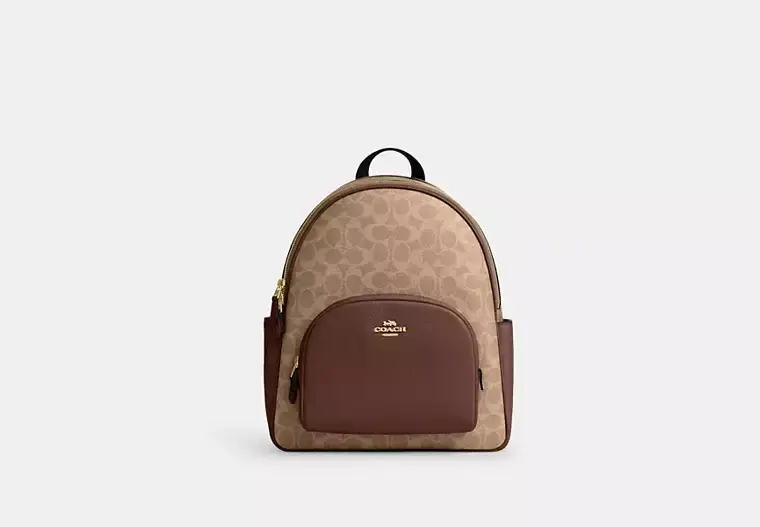 Medidas Largo: 27 cm Alto: 32 cm Ancho: 12 cm Materiales Lona revestida de la marca y cuero liso Forro de tela Asa Asa con 5,7 cm de longitud Correa Correas de hombro ajustables Características Bolsillo exterior con cremallera Bolsillos interiores con cremallera y multifunción Cierre de doble cremallera