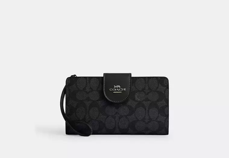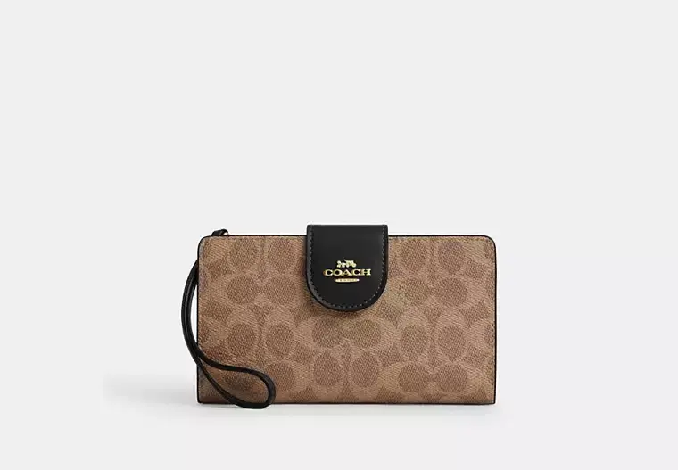 Medidas Largo: 18,3 cm Alto: 11,4 cm Materiales Lona revestida con la firma Correa Correa de muñeca integrada Características Bolsillo exterior con cremallera Seis ranuras para tarjetas de crédito Cierre a presión Compartimento para teléfono con cierre a presión Compatible con todos los iPhone y Samsung Galaxy Ventana para DNI