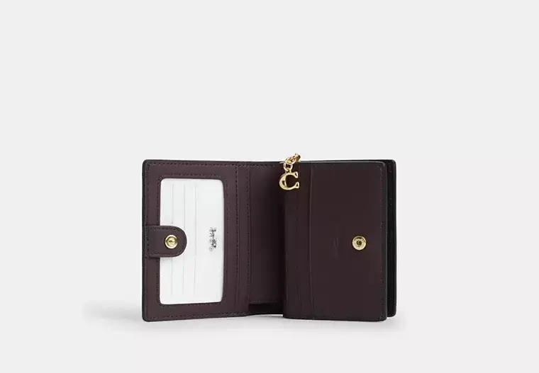 Medidas Largo: 10,8 cm Alto: 8,9 cm Ancho: 2,5 cm Materiales Lona revestida de la firma Características Bolsillo exterior para monedas con cremallera Tres ranuras para tarjetas de crédito Cierre a presión Compartimento completo para billetes Ventana para DNI